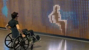 I wrote software that ingests the feeds from 7 RGB cameras and then, using MoveNet, finds human forms as “skeleton data”. Then the software does some blending to merge the data into one coordinate system, and then re-constructs the skeleton as silhouettes, resulting in one very long image. This single image is then fed to the front-end visuals system in order to make the wall interactive. Additional “optical flow” data is also sent to the front end to accommodate times when there are too many people in the concourse to track accurately.